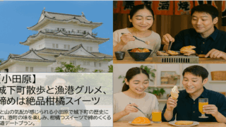 都心から約1時間、小田原で楽しむ“大人の半日デート”。白亜の天守が迎える城下町を散策し、漁港直送の浜焼きや海鮮丼で舌鼓。締めは地元産柑橘を使ったスイーツで爽やかに。歴史、グルメ、自然の三拍子がそろった、歩いて語って心地よく過ごせる王道プランです。